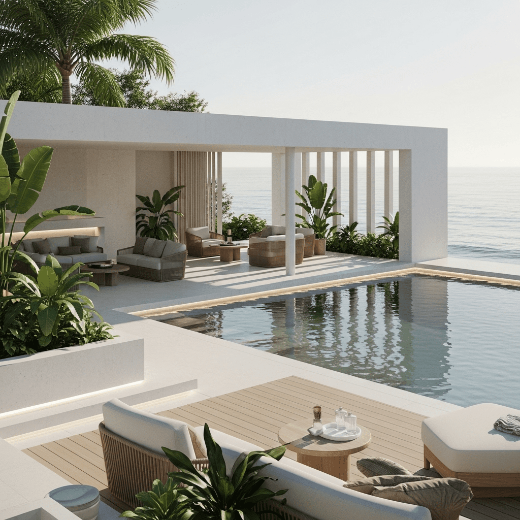 Coastal minimalism perfectly captures the design direction for 2025’s modern pool design trends Florida homeowners are embracing. Clean lines, natural materials, and an emphasis on harmony with the environment define this new era of luxury outdoor living.