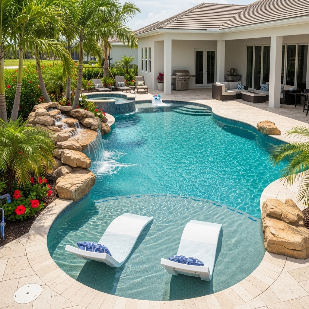 Let me paint you a picture. Last Friday evening, I walked past the Millers’ backyard and had to do a double-take. What used to be a basic concrete pool is now a resort-style pool in Fort Myers, complete with a pool waterfall feature, stone grotto, and a swim-up bar that would make any vacation jealous. And they’re not alone. Across our neighborhood, ordinary backyards are getting staycation-worthy pool transformations.
